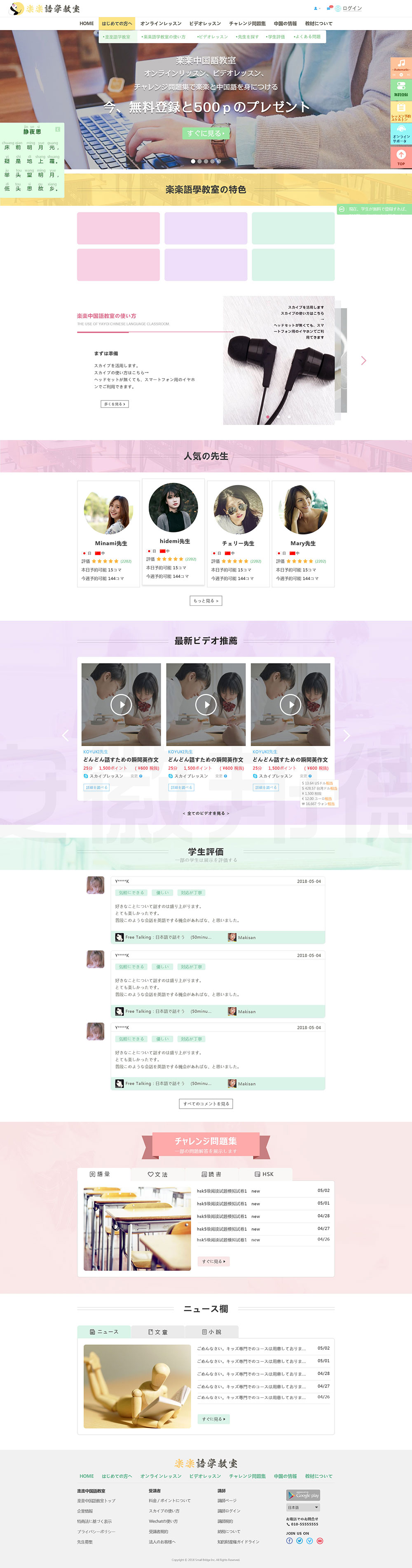 ネットチャイナは日本で最初に設立したオンラインで中国語レッスンを提供する会社の一つです。仕事の忙しいサラリーマン・経営者・中国駐在員・主婦や学生など様々の生徒様に、時間と場所の制限無く、自由にレッスンを受講でき環境を提供して来ました。 2012年設立以来、計200,000コマ以上のレッスンを提供して来まして、98.2%の生徒様から満足の声を頂きました。邦德开发为客户提供网站效果图设计, HTML5页面设计,程序开发和数据库开发,每位客户均按照需求提供定制设计开发,签订合同,分期付款,并提供完善的售后技术支持,第 一年免费送.com域名和10G(200M带宽)服务器空间。以下网站开发案例效果图我们为了防盗打了水印,网站开发案例均可提供网址和详细功能开发清单,详细内容可以咨询邦德开发客服人员微信!